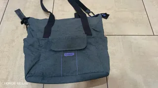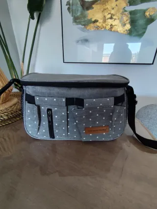 Práctica bolsa de tela para carrito de bebé, color gris oscuro. - Compartimento principal con cierre. - Bolsillo frontal con solapa. - Asas de mano y correa para colgar. En buen estado con alguna marca de uso. Las correas donde se coje al carro están desgastadas y el velcro engancha poco, pero pueden reemplazarse. Medidas: 43x34x14