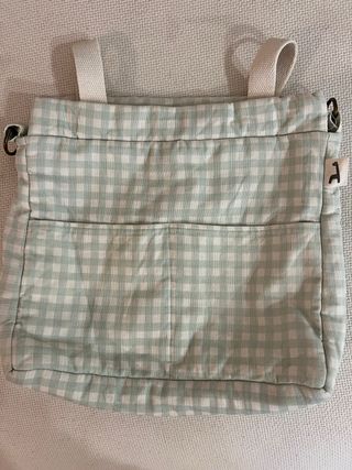 Bolso de tela con estampado de cuadros vichy en tonos verdes y blancos, ideal para colgar en el carrito de bebé. Cuenta con dos bolsillos frontales y asas superiores.
