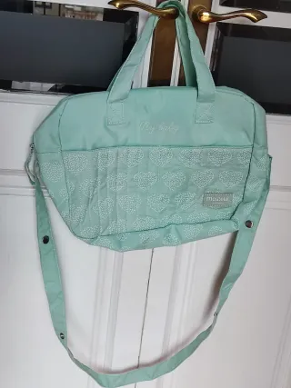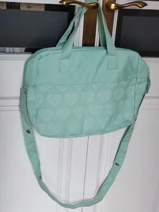Bolso de maternidad de la marca Mustela en color mint, con un bonito estampado de corazones. - Diseño acolchado con corazones blancos. - Incluye asas de mano y correa ajustable para colgar. - Cierre de cremallera.