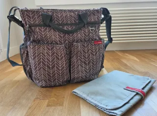 Bolso Skip Hop con estampado geométrico en tonos grises y blancos. Incluye una colchoneta cambiador a juego. Funcionan todas las cremalleras - Múltiples bolsillos exteriores. - Asas de mano y correa para colgar. - Colchoneta cambiador plegable.