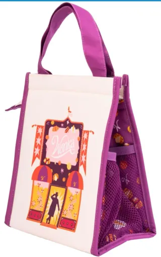 Vendo bolsa térmica tipo lunch bag Wonka (para comida/merienda), color crema con ribetes morados y diseño “Wonka”. 🆕 Nueva a estrenar, viene precintada en su bolsa y con etiqueta (ver fotos). ❄️ Ideal para llevar tupper, snack o bebida al trabajo, cole o excursiones. 🎒 Asa superior y bolsillos laterales de rejilla (como se ve en la imagen). ✅ Estado: nueva, sin uso
