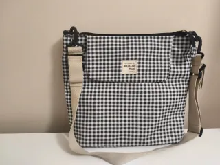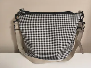 Bolso de carro con un diseño de cuadros blancos y negros. - Estampado de cuadros. - Etiqueta de la marca Walking Mum.