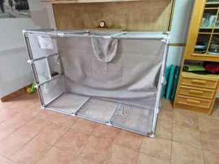 Parque infantil de tela y estructura metálica, ideal para que los más pequeños jueguen de forma segura. - Laterales de malla transpirable. - Puerta con cremallera. - Incluye bolsa de transporte.