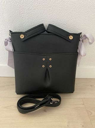 Se puede utilizar como mochila, como bolso o bandolera. Se le puede dar cualquier uso, no es necesario que sea para bebés. Tiene 3 bolsillos por fuera. Muy amplia. No pesa nada. Usada muy pocas veces. - El diseño es en espiga, tonos grises y es impermeable. - Detalles en polipiel negra. - Bolsillos laterales. - Asas superiores y correas de mochila y para bolso - cambiador - funda térmica para mantener la temperatura Nos regalaron otra y ésta apenas la hemos utilizado.