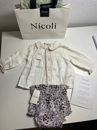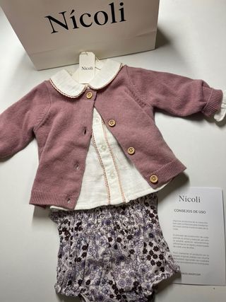 A estrenar con etiquetas. Incluye papel y bolsa de regalo. Chaqueta 100% lana. Ranita y camisa 100% algodón. Talla 3-6 meses