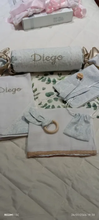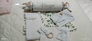 Conjunto de bebé personalizado con el nombre Diego. Incluye varios elementos para el cuidado y entretenimiento del bebé. - Cojín alargado con nombre bordado. - Manta o arrullo con borde decorativo. - Mordedor de madera. - Bolsa de tela con cordón. - Mascarilla de tela. - Pequeño detalle de madera con nombre.