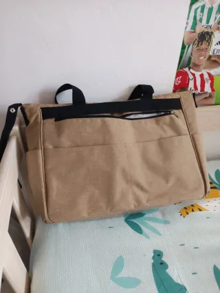 Bolso de gran capacidad, ideal para llevar todo lo necesario para dos bebés o para un uso intensivo. - Color beige. - Asas negras. - Múltiples bolsillos exteriores e interiores. - Cierre con cremallera.