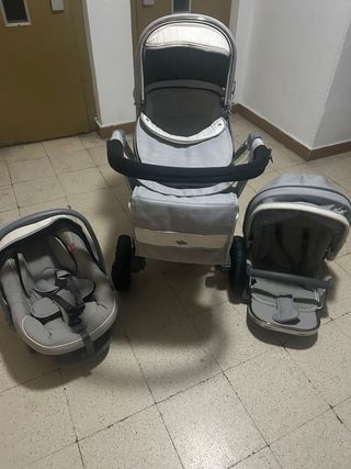 Conjunto de cochecito para bebé de la marca Jane, compuesto por tres piezas. Color gris azul negro. Tiene bolso. Hacil de desmontar y montar. Está en perfecto estado - Silla de paseo. - Capazo. - Silla de coche.
