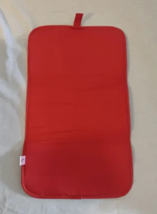 Bolso de polipiel de la marca TUCTUC de color rojo, ideal para cochecito o para ir de viaje. Tiene un bolsillo exterior y en el interior dos bolsillos y un departamento con cremallera. Tiene un asa larga para colgar, dos de mano y dos asas extraíbles para enganchar en el carrito. Medidas: 41*28*15 Incluye un cambiador.