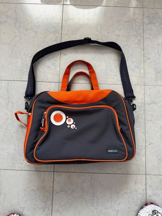 Bolso para bebé con un diseño moderno y práctico. - Color gris oscuro con detalles en naranja. - Asa de mano y correa ajustable para colgar. - Compartimentos interiores para organizar. - Adorno de círculos en la parte frontal.