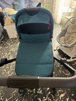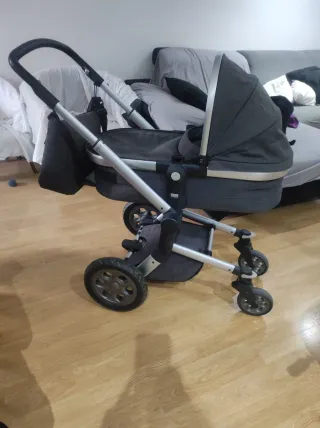 Chasis de Aluminio: Estructura ligera y robusta con sistema de plegado compacto. Equipado con ruedas de gran durabilidad y suspensión integrada para un desplazamiento suave en entorno urbano. Unidad versátil que se adapta al crecimiento del lactante, permitiendo su uso como capazo rígido inicial y posteriormente como silla de paseo reversible. Silla de coche Arnés de 5 puntos con protectores acolchados. Bolso cambiador a juego y cesta inferior de gran capacidad. Textiles higienizados; sin roturas, manchas ni desgaste significativo en el manillar o ruedas.