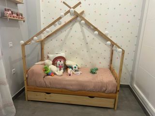 Cama infantil con diseño de casita, fabricada en madera, para niños incluye colchón de 80x160 (colchón incluido en el precio) usada durante 2 años y medio, en buen estado. Incluye cajón bajo cama. No hacemos envíos, habría que recogerla - Estructura de madera. - Diseño de casita. - Cajón inferior.