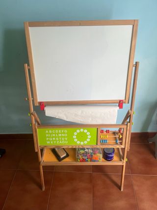 Pizarra de madera de doble cara para que los más pequeños aprendan y se diviertan. Incluye un rollo de papel. - Pizarra negra para tiza y superficie blanca para rotuladores. - Incluye un rollo de papel. - Estructura de madera. - Compartimento inferior para guardar materiales. - Incluye ábaco, letras y números. - Rueda con números y agujas para aprender las horas.