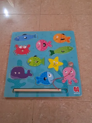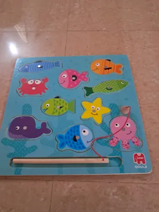 Divertido juego de pesca imantado de la marca Goula. Ideal para los más pequeños. - Incluye varias piezas de animales marinos. - Caña de pescar con imán. - Base de madera con diseño marino.