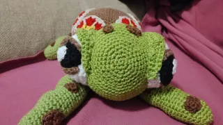 Adorable tortuga tejida a mano, perfecta para decorar o jugar. - Cuerpo principal en color marrón con detalles florales. - Patas y cabeza en color verde. - Pequeños detalles marrones en las extremidades y cabeza.