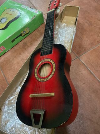 Guitarra de juguete para niños, ideal para iniciarse en la música. Presenta un diseño llamativo y colorido. - Cuerpo de color rojo y negro. - Mástil y diapasón negros. - Clavijero blanco con afinadores.