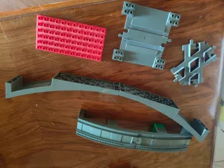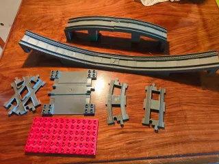 Conjunto de vías para trenes de Lego. - Piezas de vías rectas 19 - Piezas de vías curvas 40 - Piezas de conexión (pinzas) varias - Base roja de construcción.