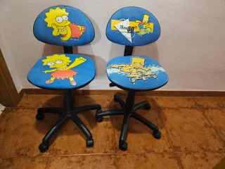 Conjunto de dos sillas de escritorio infantiles con diseño de Los Simpson. Perfectas para habitaciones de niños y niñas. - Diseño de Lisa Simpson en una silla. - Diseño de Bart Simpson en la otra silla. - Base giratoria con ruedas. Precio de 20€ por silla.