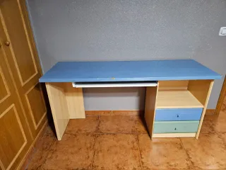Escritorio infantil con un diseño divertido y práctico. Perfecto para el estudio o el juego. - Superficie azul con mapa de Europa. - Bandeja extraíble para teclado. - Compartimento abierto. - Dos cajones de almacenamiento (azul y verde). Es de madera maciza, pesa bastante, tiene algunos desperfectos del uso del producto. Se incluyen en las fotos.