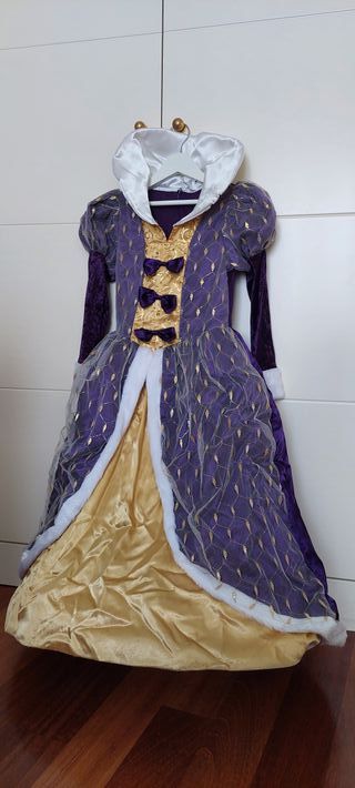 Vestido de niña fabricado en España de manga larga, talla 10 años. Color mostaza con detalles en azul. - Cuello redondo con ribete azul. - Pequeño aplique de estrella azul en el pecho. - Bolsillo delantero con ribete azul. - Falda con volantes y estampado de estrellas blancas sobre fondo azul.