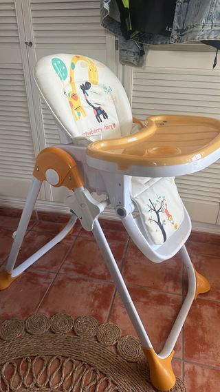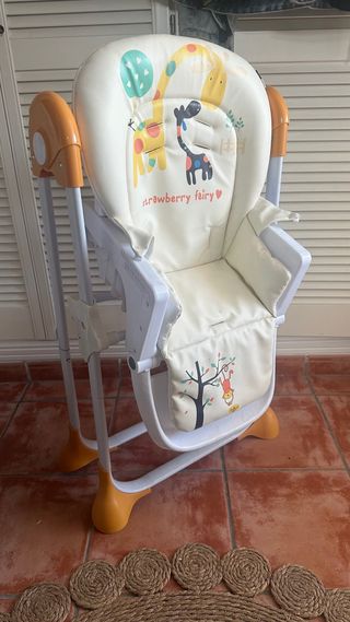 Trona para bebé con un diseño adorable y confortable. - Cojín acolchado con estampado de jirafas y texto strawberry fairy. - Funda extraíble con dibujo de un personaje colgado de un árbol. - Estructura blanca y naranja. - Patas antideslizantes.