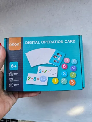 Juego educativo para aprender números y operaciones básicas. - Incluye fichas con números del 0 al 10. - Fichas con signos de operaciones (+, -, =). - Tarjetas con ejercicios de sumas y restas. - Fichas de colores (verde, azul, rojo, morado, rosa). - Ficha con símbolo de 'check' verde.