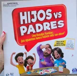 Juego de mesa Hijos vs Padres de Spin Master. Una batalla familiar con apuestas. - Contiene piezas pequeñas, no apto para menores de 3 años. - Edad recomendada: 6+ años. - Para 2 o más jugadores.