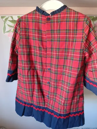Vestido de niña de la marca Miranda, con un diseño de cuadros clásico en tonos rojos. Ideal para ocasiones especiales o para el día a día. - Estampado de cuadros escoceses en rojo, azul y amarillo. - Detalle de lazo grande en la parte delantera. - Cuello con volante. - Puños y bajo con detalle de puntilla y volante.