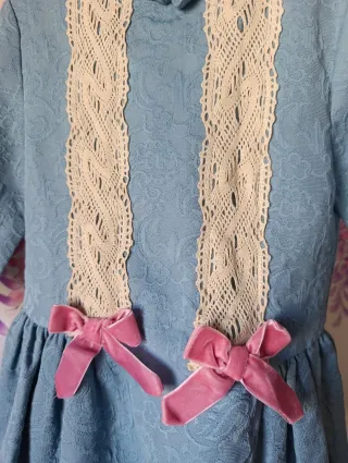Vestido de Dolce Petit para niña, con un bonito diseño. - Color azul claro. - Detalle de encaje beige en el frontal. - Lazos de terciopelo rosa. - Bajo con puntilla y cinta rosa.