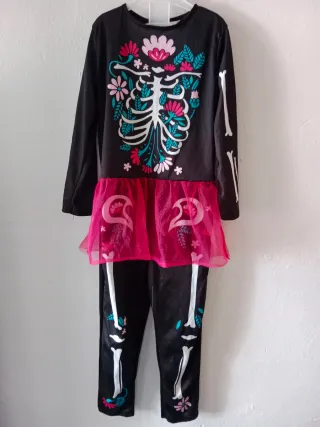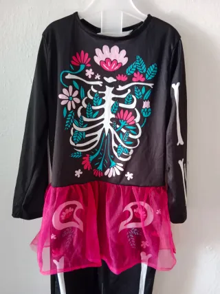 Disfraz de Catrina con diseño de esqueleto y flores. - Mangas largas negras. - Falda de tul rosa. - Pantalones negros con estampado de esqueleto y flores. 110cm.