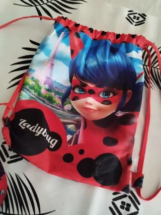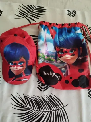 Conjunto infantil de Ladybug con gorra y mochila. - Gorra roja con diseño de Ladybug. - Mochila con cordones y estampado de Ladybug y la Torre Eiffel.