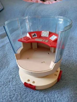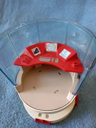 Pieza de centro de mando para Playmobil. Este accesorio añade un toque futurista a tus escenarios. - Diseño curvo con paneles transparentes. - Consola central roja con detalles de teclado y pantallas. - Base redonda con detalles decorativos.