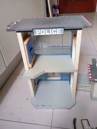 Set de Playmobil de una jefatura de policía con accesorios. - Edificio principal de dos plantas con detalles. - Edificio anexo con tejado a dos aguas. - Incluye escaleras, mobiliario y figuras. - Ideal para coleccionistas y juego infantil