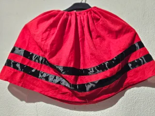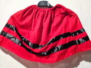 Falda de estilo pastora para niña, ideal para fiestas o actuaciones. - Color rojo vibrante. - Diseño con cintas negras. - Cintura elástica para mayor comodidad Talla 9-12meses.