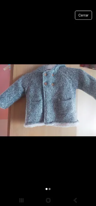 Precioso chaquetón para bebé niño, ideal para mantenerlo abrigado. - Diseño tejido en color gris y blanco. - Cierre con botones. - Bolsillos delanteros. - Forro interior suave.
