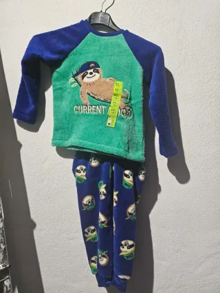 Conjunto de pijama infantil con divertido estampado de perezosos. - Parte superior de manga larga en verde con estampado de perezoso y texto CURRENT MOOD. - Mangas y cuello en azul. - Pantalón largo azul con estampado repetido de perezosos. - Tejido suave y cómodo.