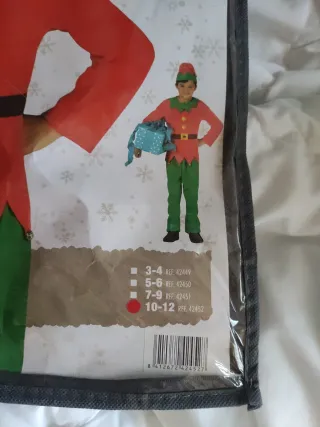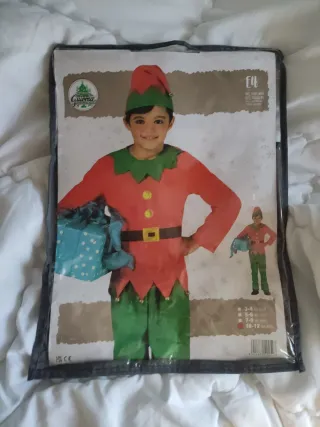 Disfraz de elfo para niño, talla 10-12 años. - Incluye gorro, traje y cinturón. - Diseño de elfo navideño con detalles en verde y rojo. - Ideal para fiestas y celebraciones.
