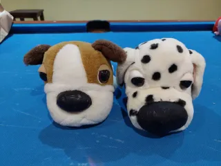 Adorables peluches con forma de perro. Precio por unidad - Peluche estilo Bulldog con detalles marrones y blancos. - Peluche estilo Dálmata con manchas negras sobre fondo blanco. - Narices y ojos negros de plástico.