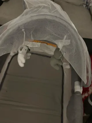 Mini cuna de color gris, ideal para los primeros meses del bebé. Incluye una práctica mosquitera para protegerle. - Estructura de metal. - Laterales de malla transpirable. - Incluye dosel mosquitera. - Uso menos de 1 mes