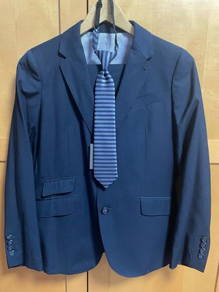 Traje de chaqueta para niño de la marca Coconut. - Chaqueta de vestir y pantalón regulable. - Incluye corbata a rayas nueva sin estrenar. - Con camisa Tizzas azul celeste. -Guardado en funda plástico El Corte Inglés