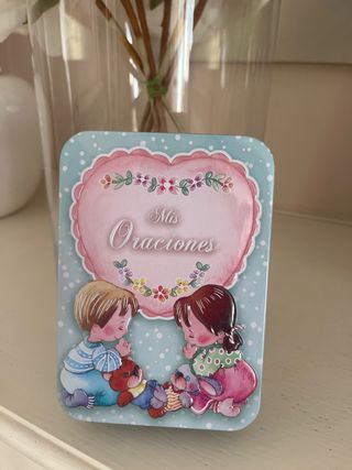 Bonita caja metálica con diseño infantil de Mis Oraciones. Ideal para guardar pequeños tesoros o como detalle. - Incluye 40 tarjetas con oraciones. - Ilustración de dos niños rezando con ositos. - Corazón decorativo con flores en la parte superior. - Fondo azul con topos blancos.