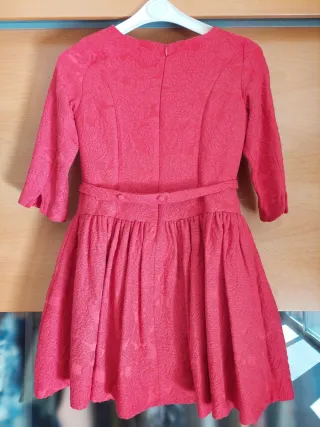 Vestido de niña en color rojo talla 10, con un diseño texturizado y un cinturón decorativo. Tiene una sola puesta. - Tejido con relieve floral. - Cinturón con hebilla cuadrada y pedrería.