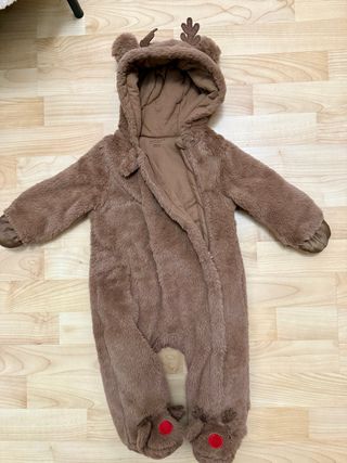 Este adorable buzo con diseño de reno es perfecto para mantener abrigado a tu bebé durante el invierno. Suave y cómodo, ideal para los meses más fríos. - Talla: 6 a 9 meses. - Material: Peluche. - Color: Marrón. - Cierre de cremallera frontal. - Capucha con orejas y cuernos de reno. - Pies con detalles de reno y pompón rojo.