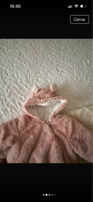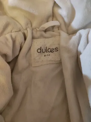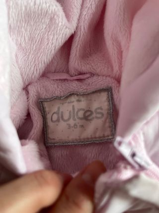 Buzo de bebé de la marca Dulces, talla 3-6 meses. Es muy suave y cálido, ideal para los días fríos. - Material exterior de peluche. - Forro interior con estampado de paraguas. - Cierre de botones de madera. - Capucha con pelo sintético.
