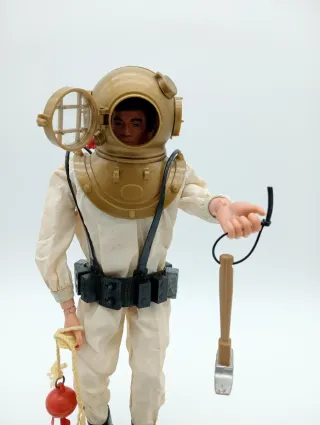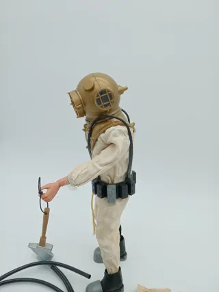 Figura de acción de un buzo de época, con detalles realistas y accesorios. - Casco de buceo dorado con escotilla. - Traje de buceo blanco. - Cinturón de lastre negro. - Cuerda con boya roja. - Herramienta tipo martillo. - cofre,3 monedas y brújula Action man ,Action joe
