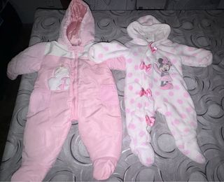 Conjunto de dos buzos para bebé, perfectos para mantenerlos abrigados. - Buzo rosa con detalles blancos con un dibujito de osito. - Buzo blanco con estampado de topos rosas y Minnie Mouse. Hasta los 68cm
