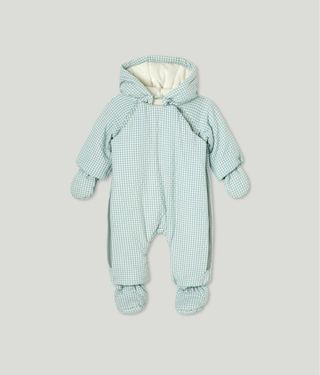 Precioso buzo de bebé de la marca Coconut, perfecto para mantener a tu pequeño abrigado. - Color verde claro. - Acolchado para mayor calidez. - Incluye gorro. - Puños y tobillos forrados en blanco.