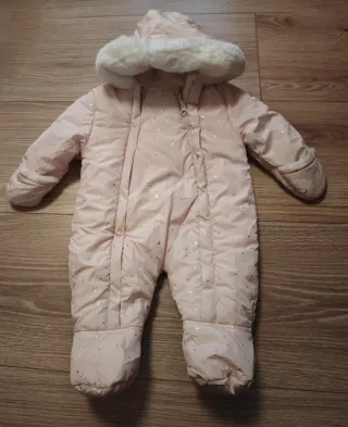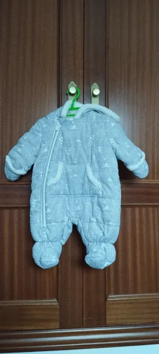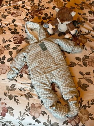 Conjunto de invierno de Zara para bebé, talla 3-6 meses. Incluye buzo, manoplas y patucos a juego. - Buzo con estampado de puntos pequeños. - Forro interior de pelo suave. - Cierre de cremallera frontal. - Manoplas y patucos con detalle de pelo.