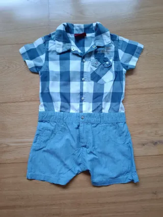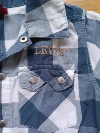Conjunto de buzo para niño de la marca Levis. - Camisa a cuadros azul y blanco. - Pantalón corto de mezclilla. - Talla 24 meses.