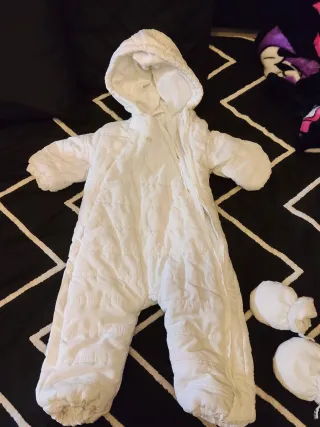 Buzo blanco acolchado para bebé, ideal para el frío. - Talla 6-12 meses. - Incluye manoplas a juego.